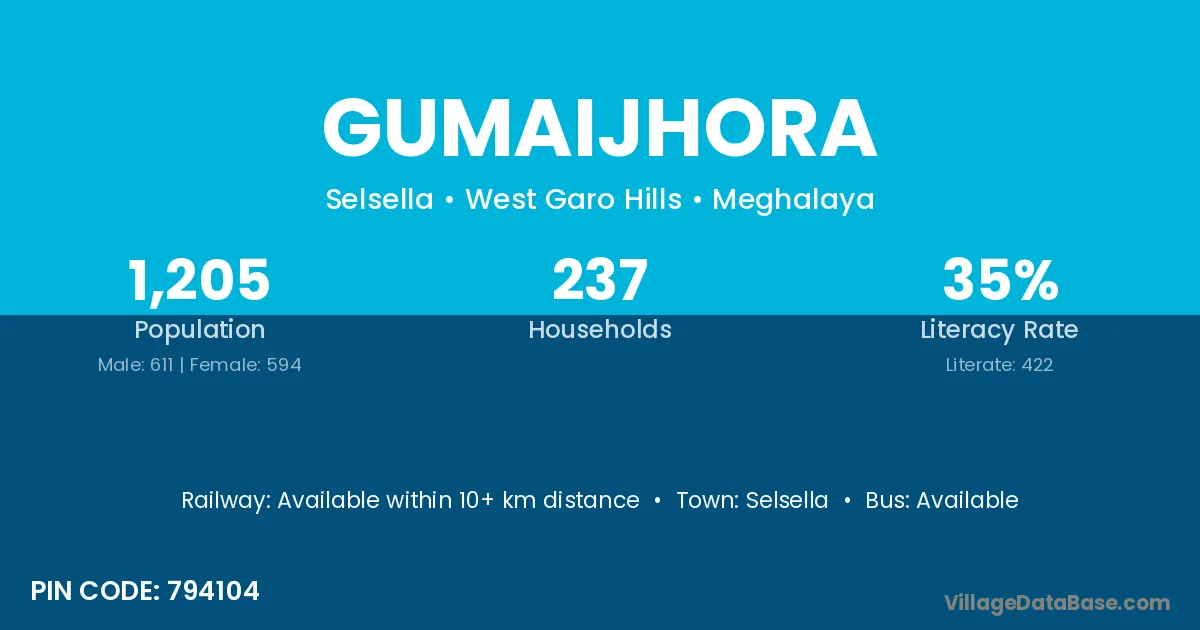 Gumaijhora village has a total population of 1,205 people, of which 611 are males and 594 are females.