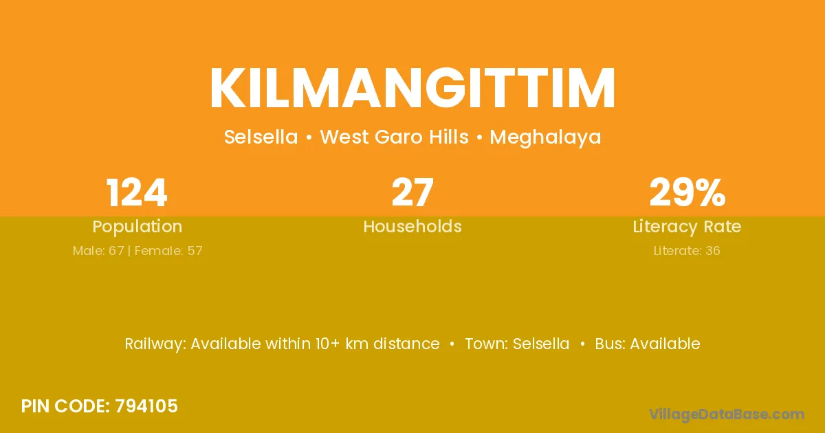 Kilmangittim village has a total population of 124 people, of which 67 are males and 57 are females.