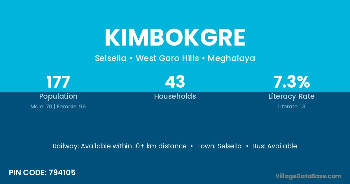 Kimbokgre village has a total population of 177 people, of which 78 are males and 99 are females.