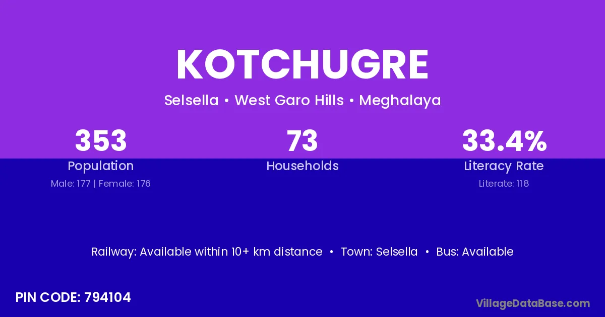 Kotchugre village has a total population of 353 people, of which 177 are males and 176 are females.