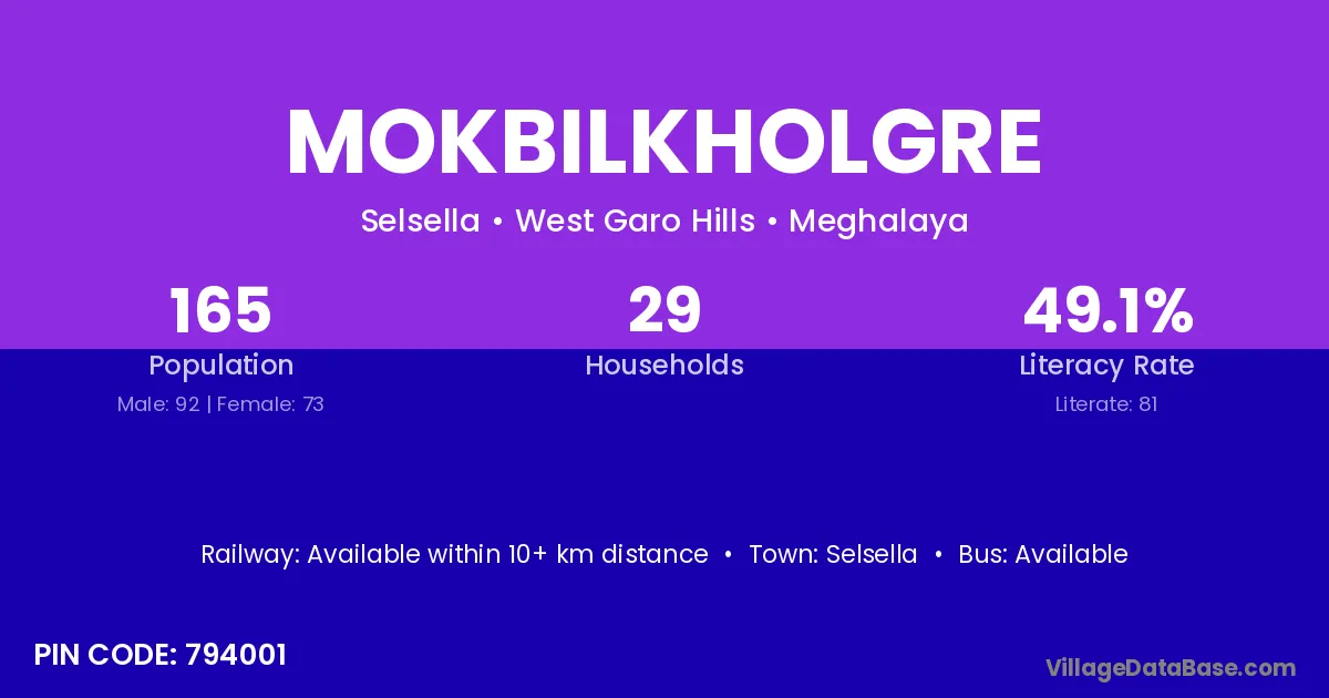 Mokbilkholgre village has a total population of 165 people, of which 92 are males and 73 are females.