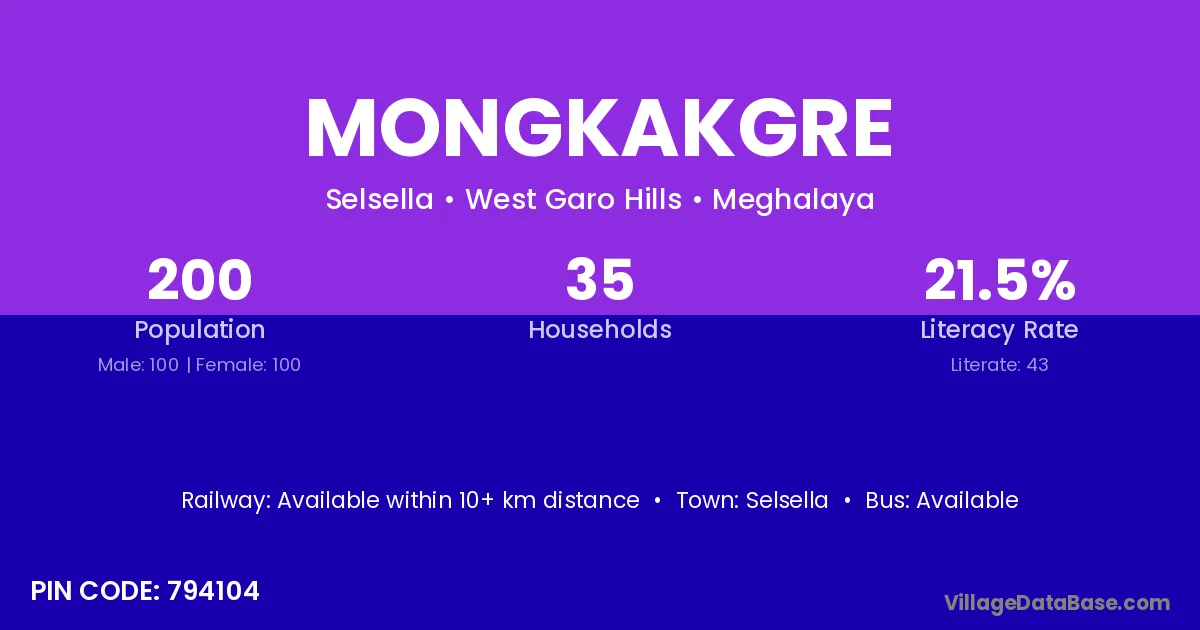 The literacy rate of Mongkakgre village is 21.50%. Male literacy stands at 24.00% and female literacy at 19.00%.