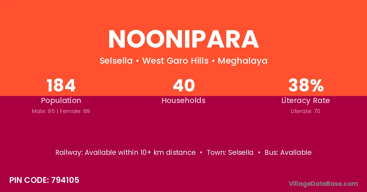 Noonipara village has a total population of 184 people, of which 95 are males and 89 are females.