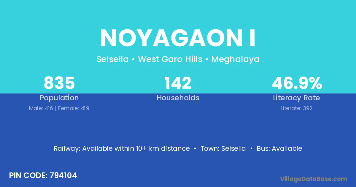 Noyagaon I village has a total population of 835 people, of which 416 are males and 419 are females.
