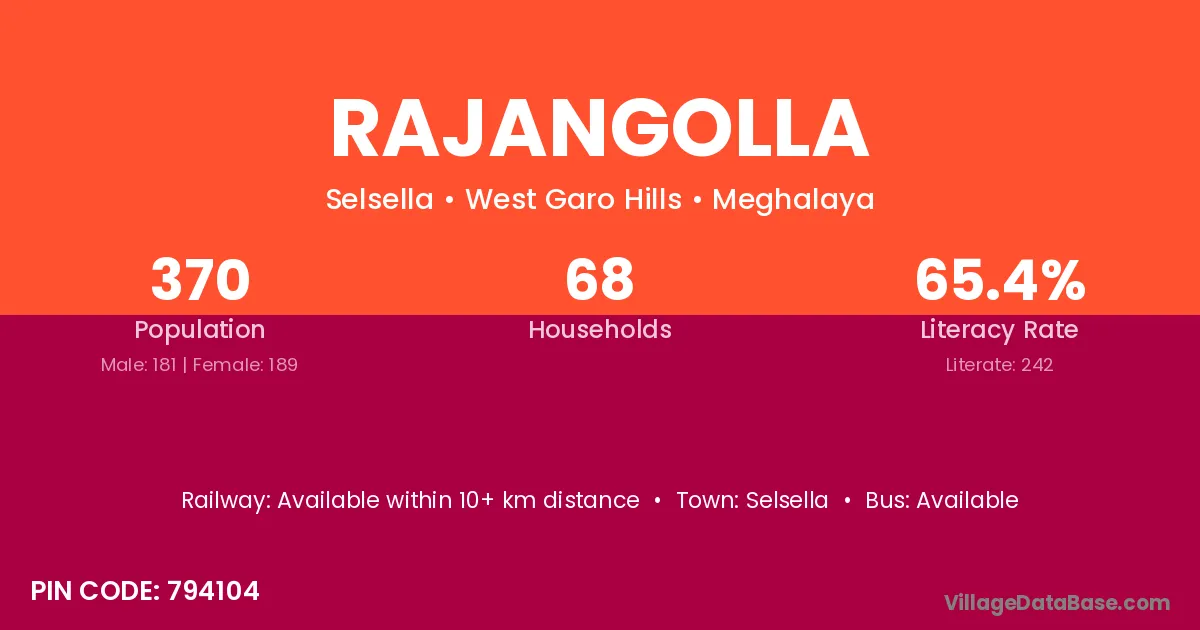 Rajangolla village has a total population of 370 people, of which 181 are males and 189 are females.