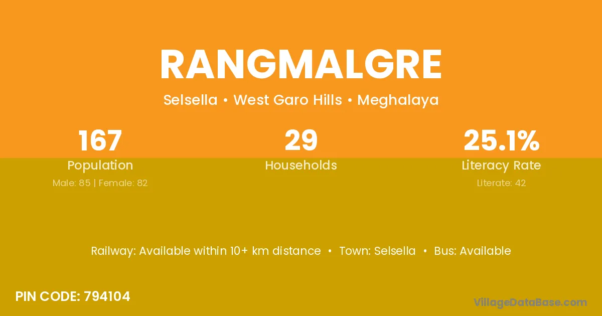 Rangmalgre village has a total population of 167 people, of which 85 are males and 82 are females.