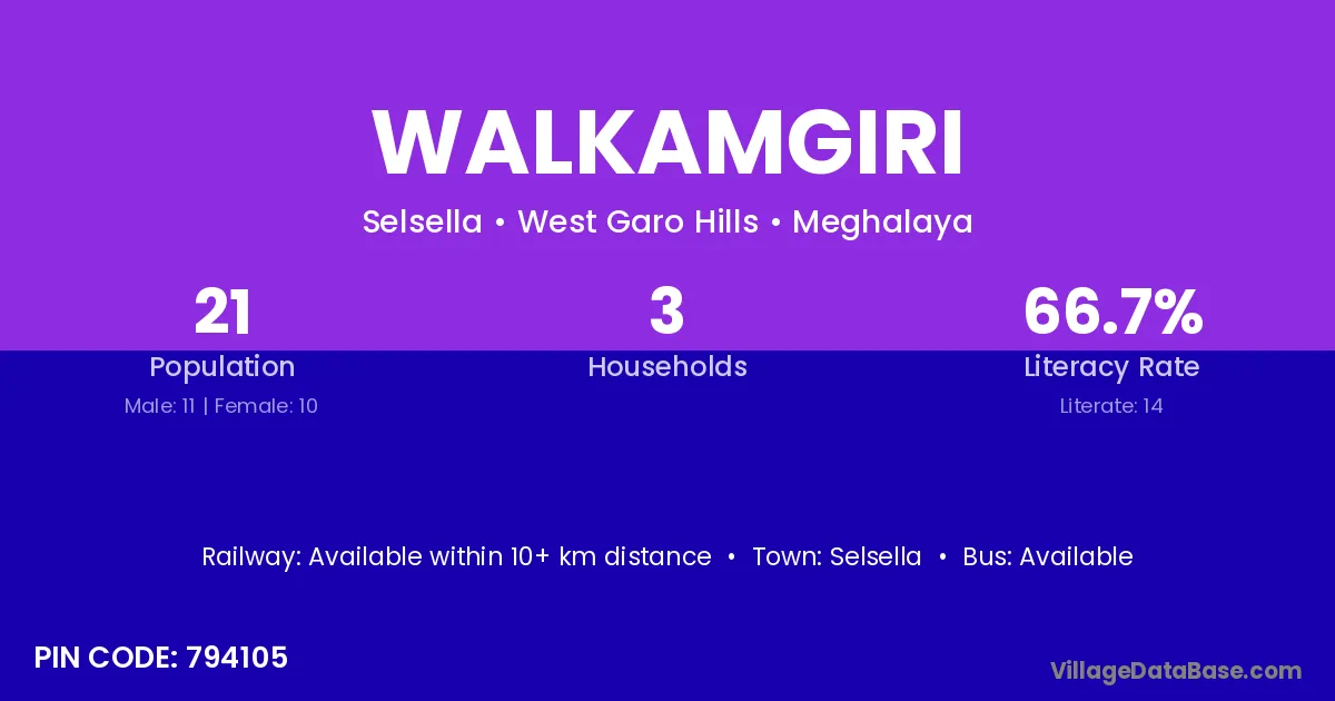 Walkamgiri village has a total population of 21 people, of which 11 are males and 10 are females.