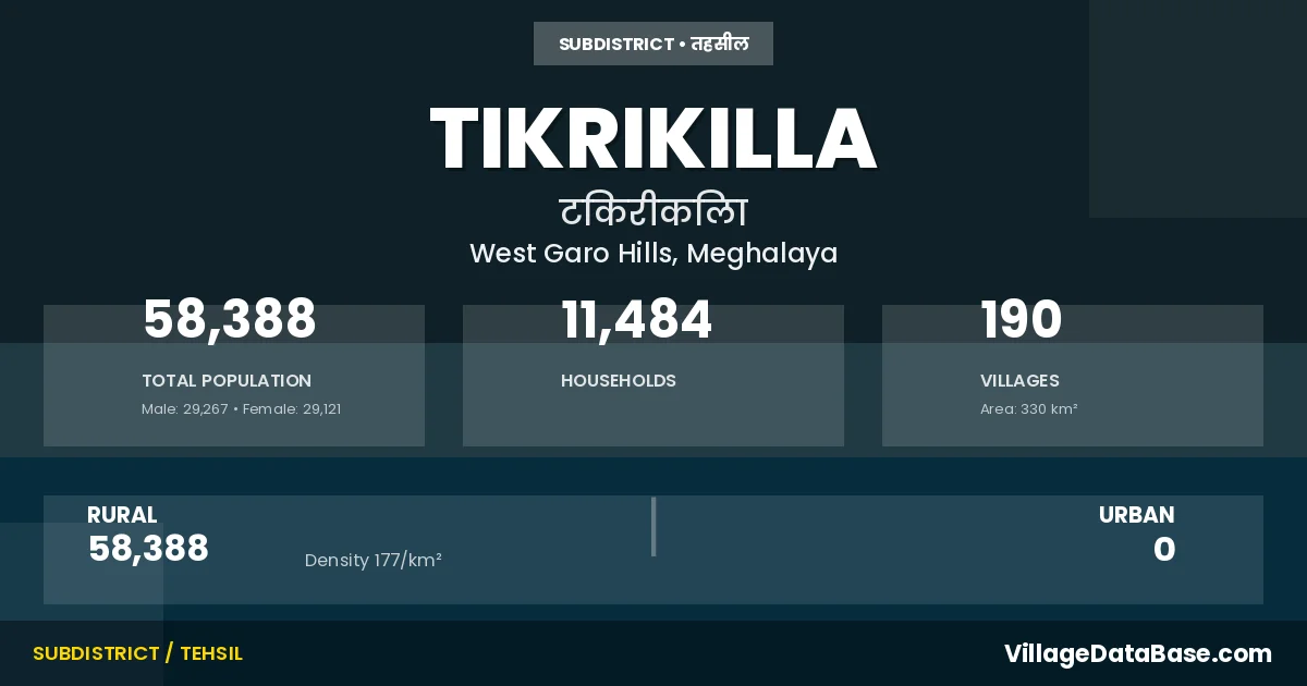 Tikrikilla is a town and Subdivision in the West Garo Hills district of the Meghalaya. In India, a Subdivision is a subdivision of a district responsible for the administration and revenue collection of a specific area within the district. Subdivisions play a crucial role in the local governance structure, contributing significantly to the development and administration of their communities.
