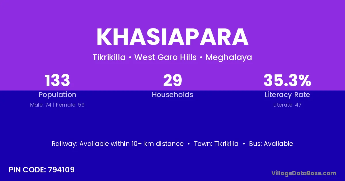 Khasiapara village has a total population of 133 people, of which 74 are males and 59 are females.