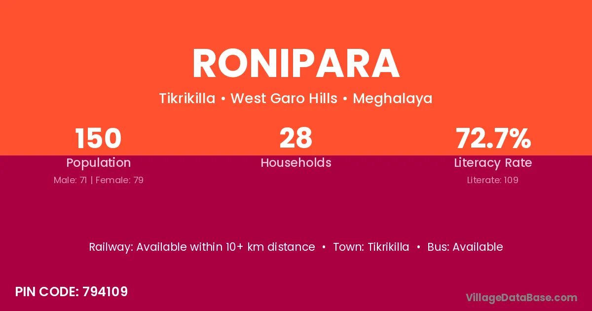 Ronipara village has a total population of 150 people, of which 71 are males and 79 are females.
