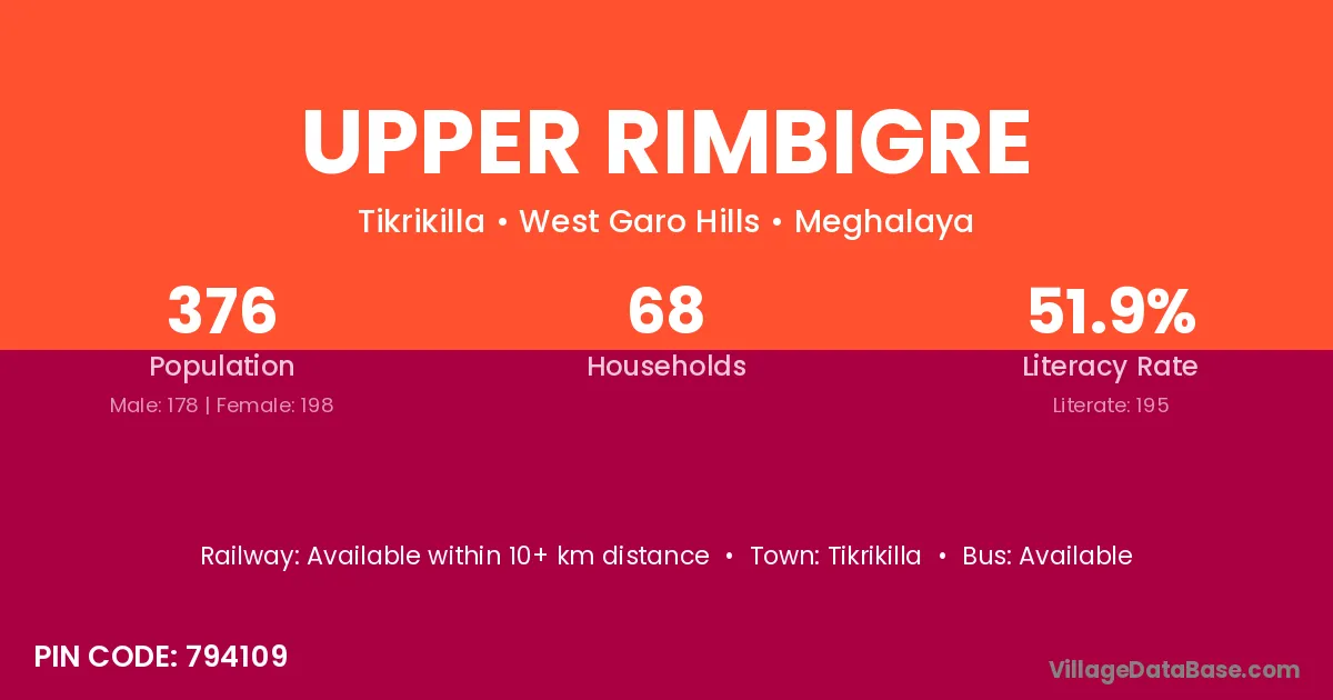 Upper Rimbigre village has a total population of 376 people, of which 178 are males and 198 are females.