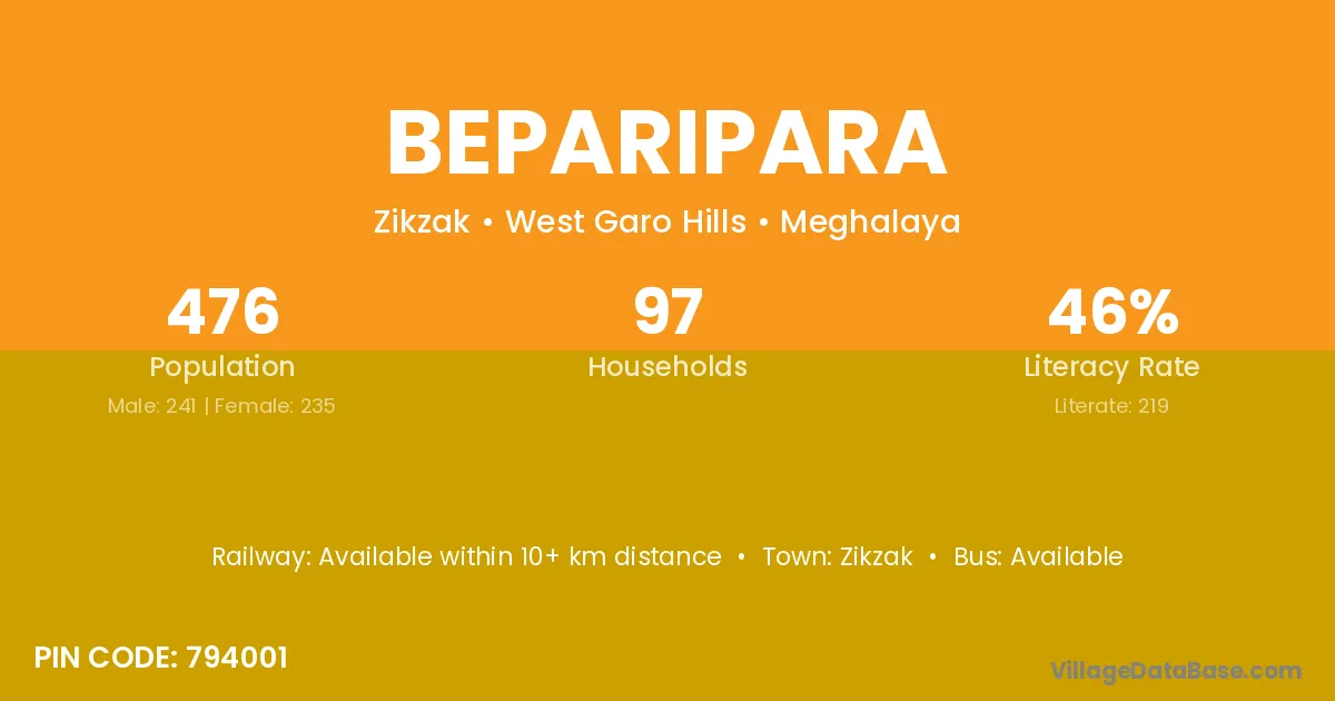 Beparipara village has a total population of 476 people, of which 241 are males and 235 are females.