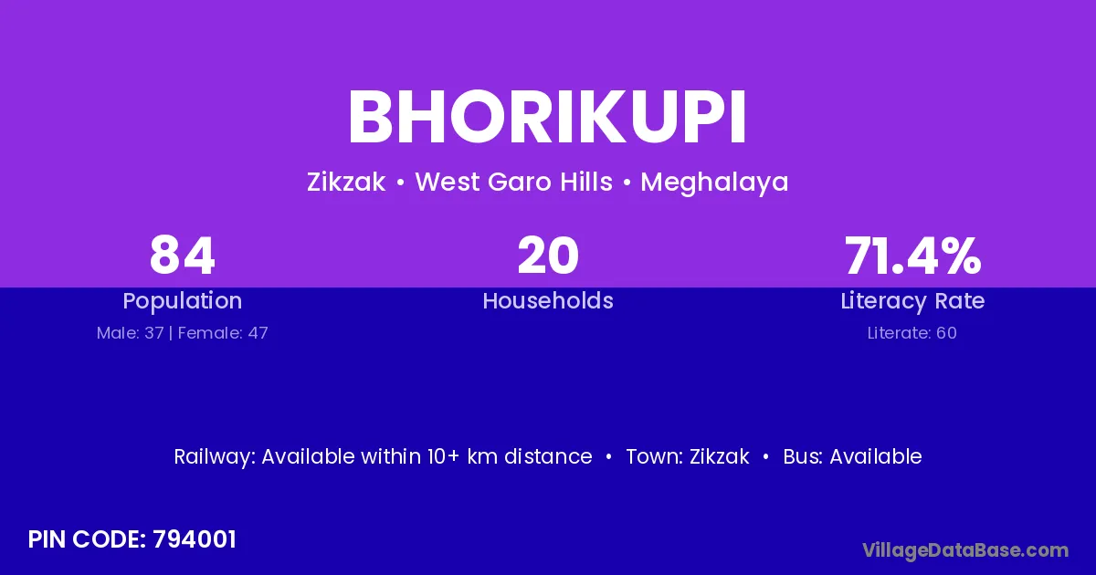 Bhorikupi village has a total population of 84 people, of which 37 are males and 47 are females.
