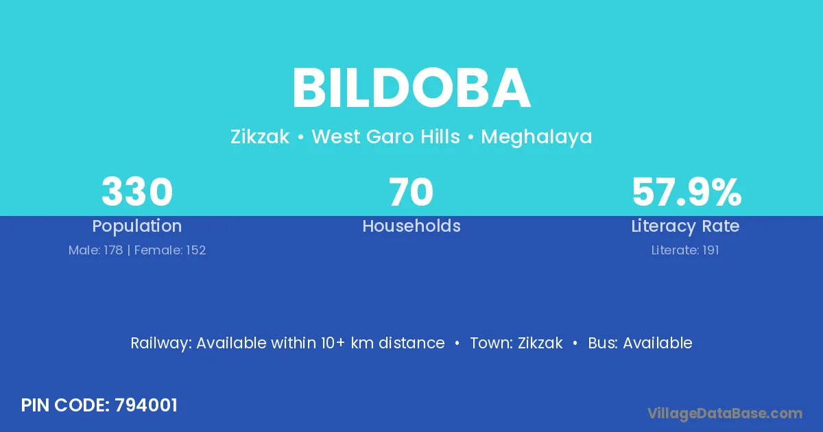 Bildoba village has a total population of 330 people, of which 178 are males and 152 are females.