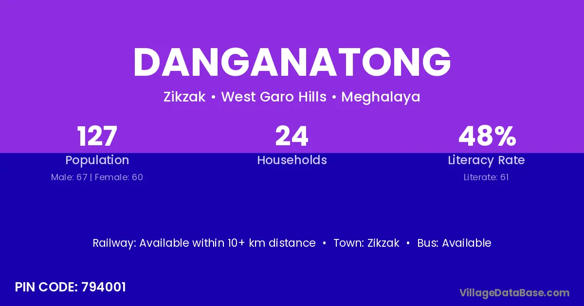 The literacy rate of Danganatong village is 48.03%. Male literacy stands at 50.75% and female literacy at 45.00%.
