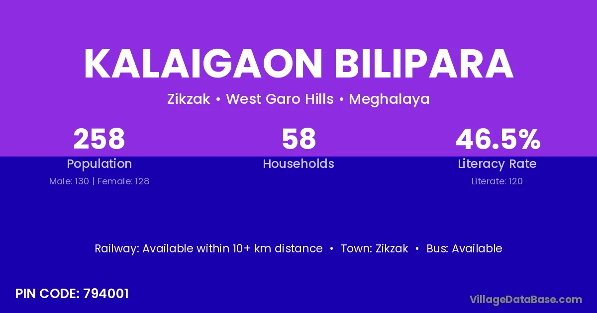 Kalaigaon Bilipara village has a total population of 258 people, of which 130 are males and 128 are females.