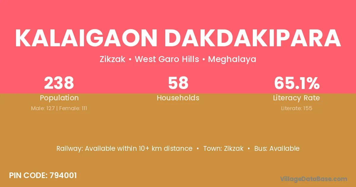 Kalaigaon Dakdakipara village has a total population of 238 people, of which 127 are males and 111 are females.