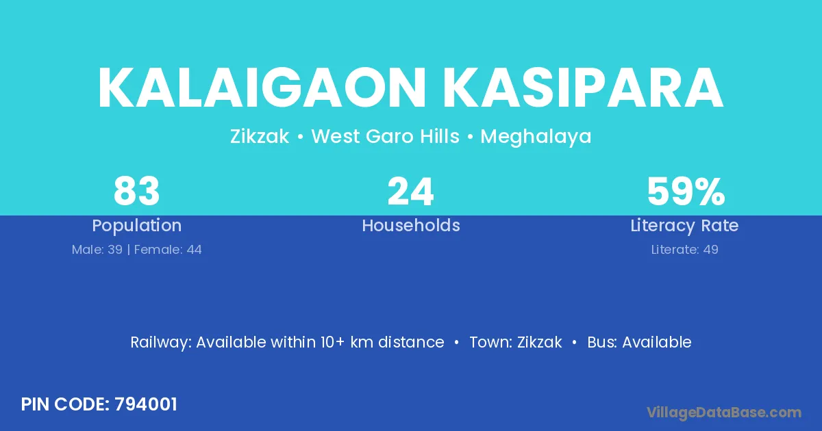 Kalaigaon Kasipara village has a total population of 83 people, of which 39 are males and 44 are females.