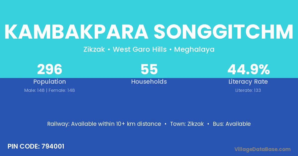 Kambakpara Songgitchm village has a total population of 296 people, of which 148 are males and 148 are females.