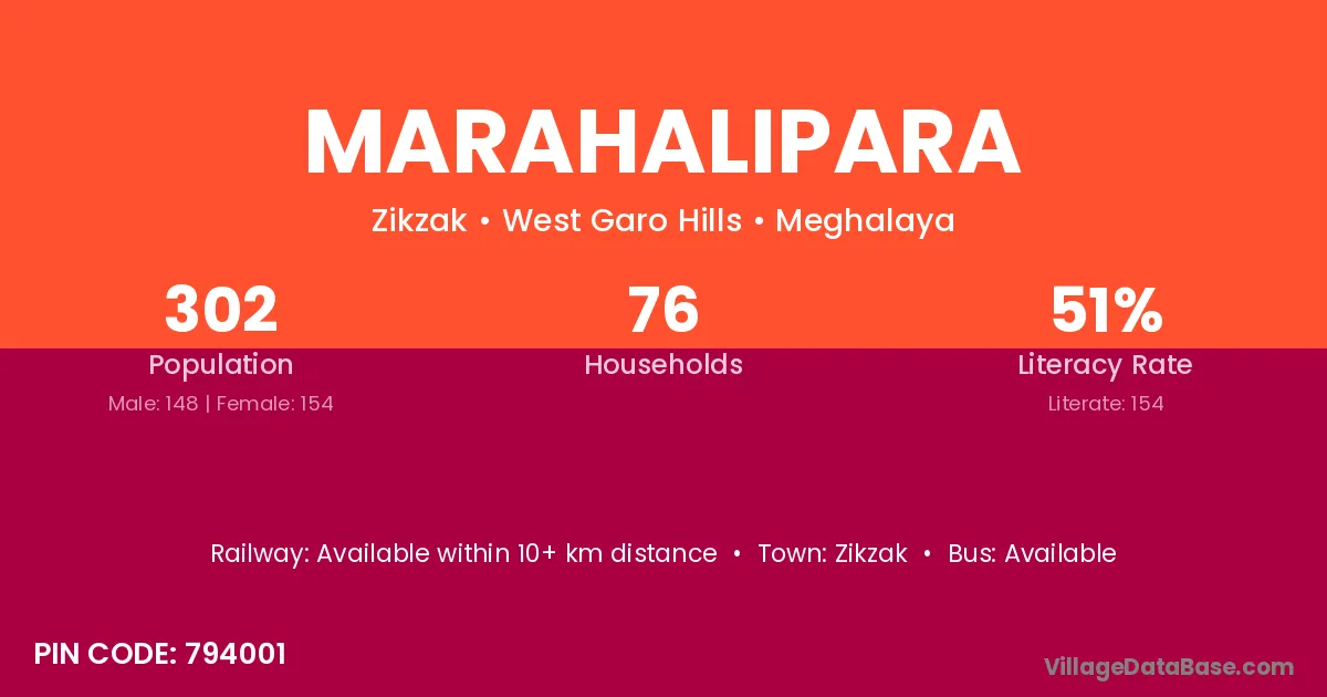 Marahalipara village has a total population of 302 people, of which 148 are males and 154 are females.
