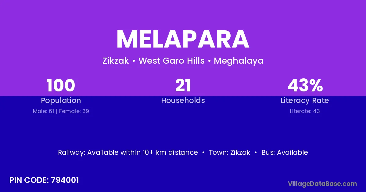 Melapara village has a total population of 100 people, of which 61 are males and 39 are females.