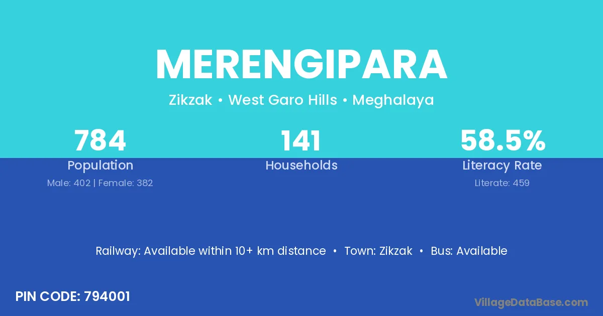 Merengipara village has a total population of 784 people, of which 402 are males and 382 are females.