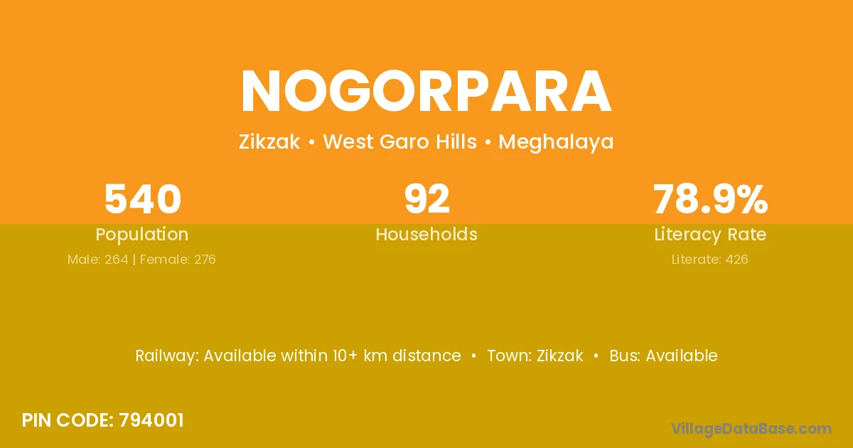 Nogorpara village has a total population of 540 people, of which 264 are males and 276 are females.