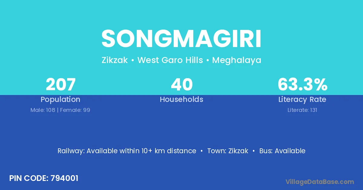 Songmagiri village has a total population of 207 people, of which 108 are males and 99 are females.