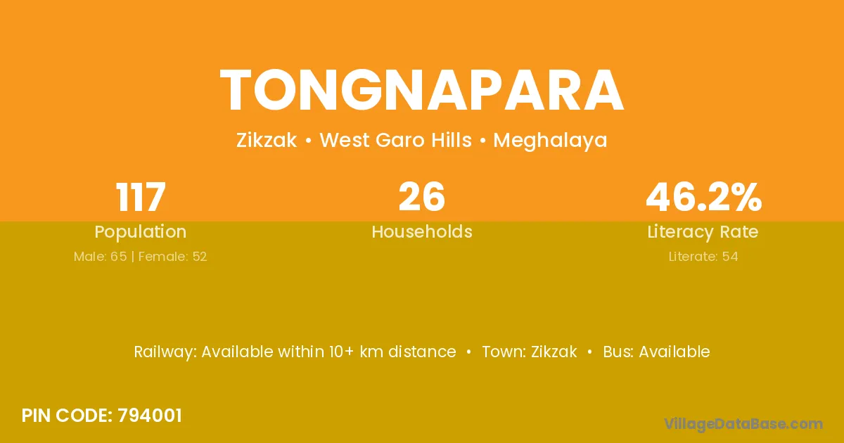 Tongnapara village has a total population of 117 people, of which 65 are males and 52 are females.
