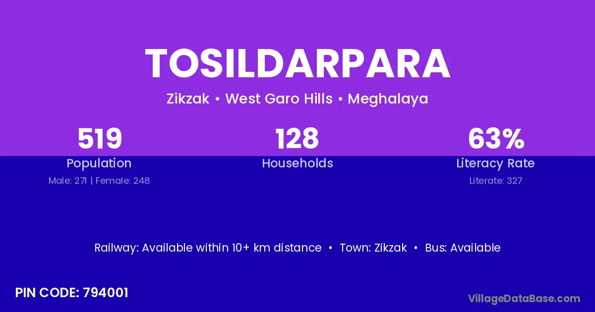 Tosildarpara village has a total population of 519 people, of which 271 are males and 248 are females.