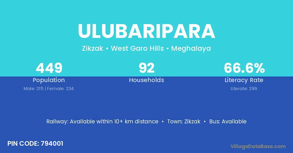 Ulubaripara village has a total population of 449 people, of which 215 are males and 234 are females.