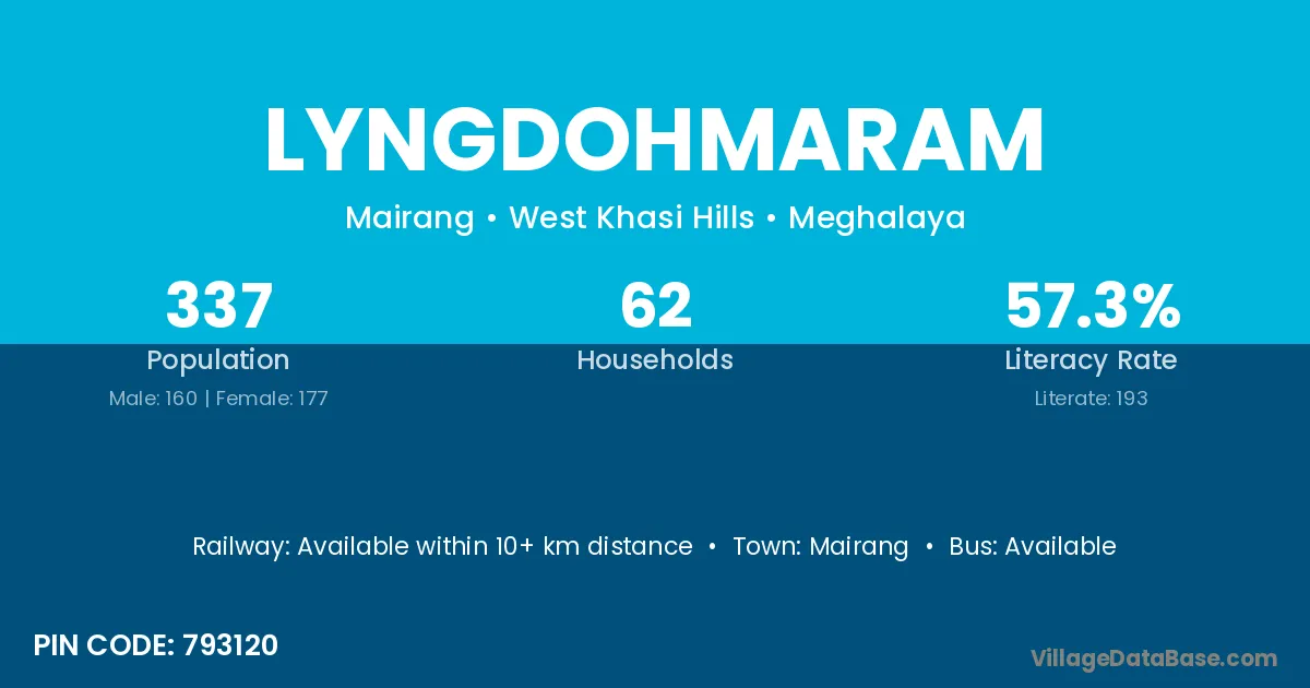 Lyngdohmaram village has a total population of 337 people, of which 160 are males and 177 are females.