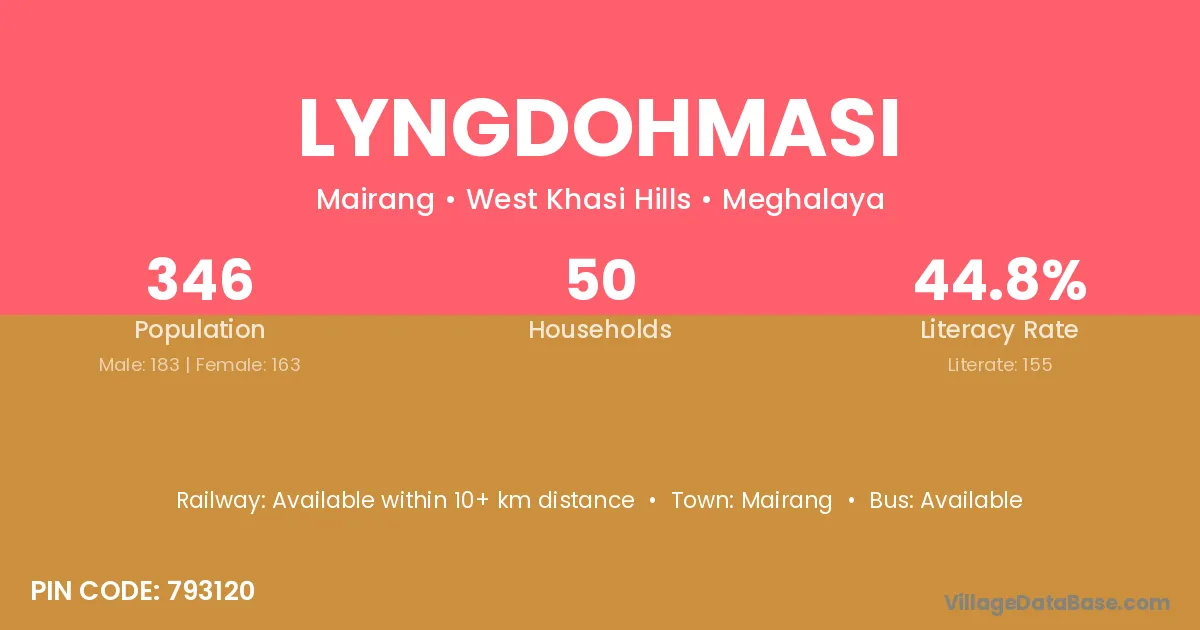 Lyngdohmasi village has a total population of 346 people, of which 183 are males and 163 are females.