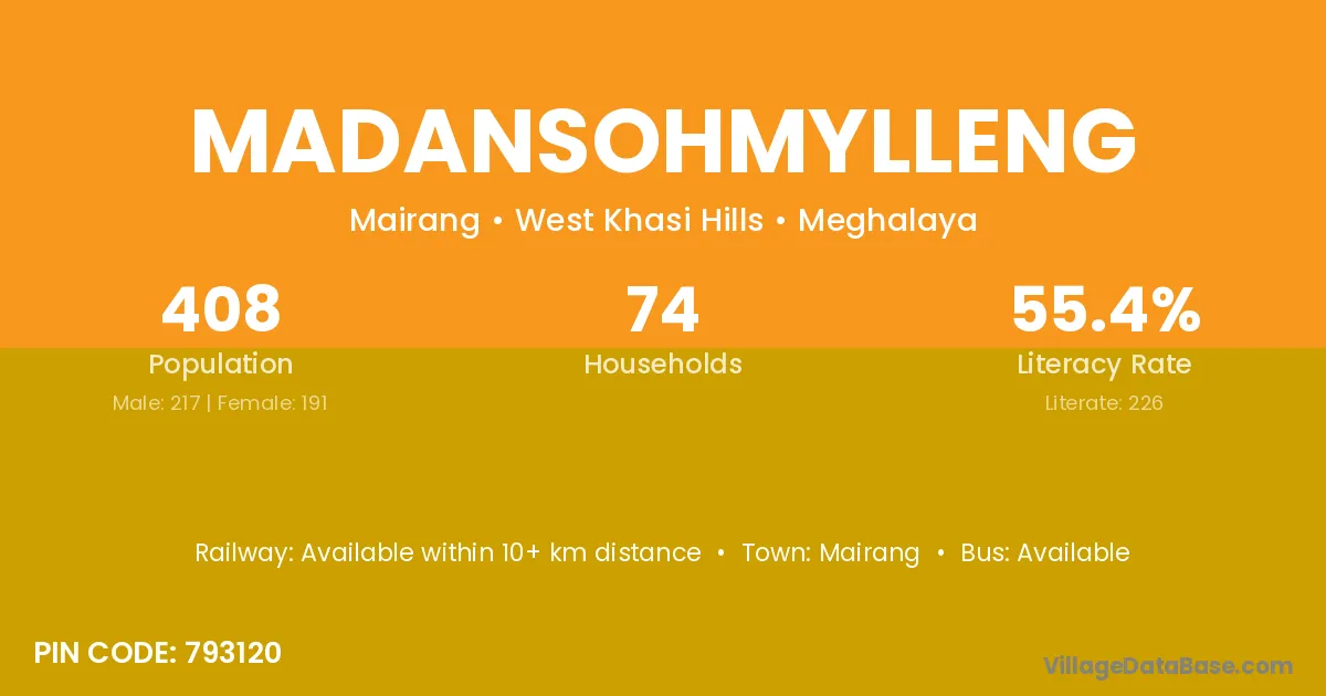 Madansohmylleng village has a total population of 408 people, of which 217 are males and 191 are females.