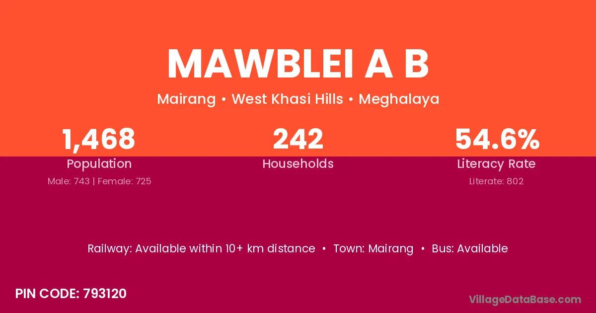 Mawblei A B village has a total population of 1,468 people, of which 743 are males and 725 are females.