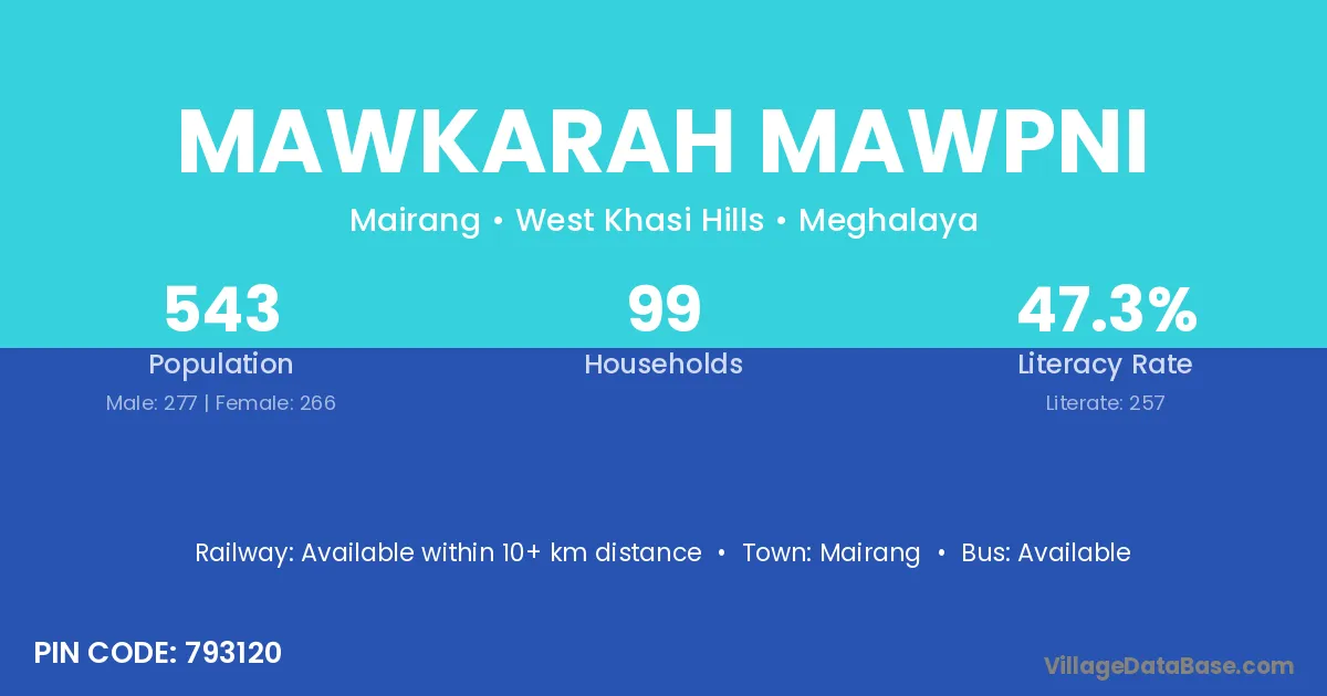 Mawkarah Mawpni village has a total population of 543 people, of which 277 are males and 266 are females.