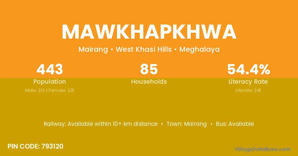 Mawkhapkhwa village has a total population of 443 people, of which 212 are males and 231 are females.