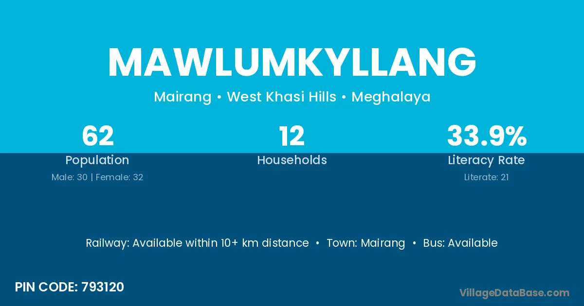 Mawlumkyllang village has a total population of 62 people, of which 30 are males and 32 are females.
