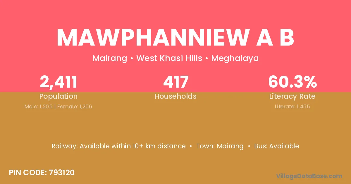 Mawphanniew A B village has a total population of 2,411 people, of which 1,205 are males and 1,206 are females.