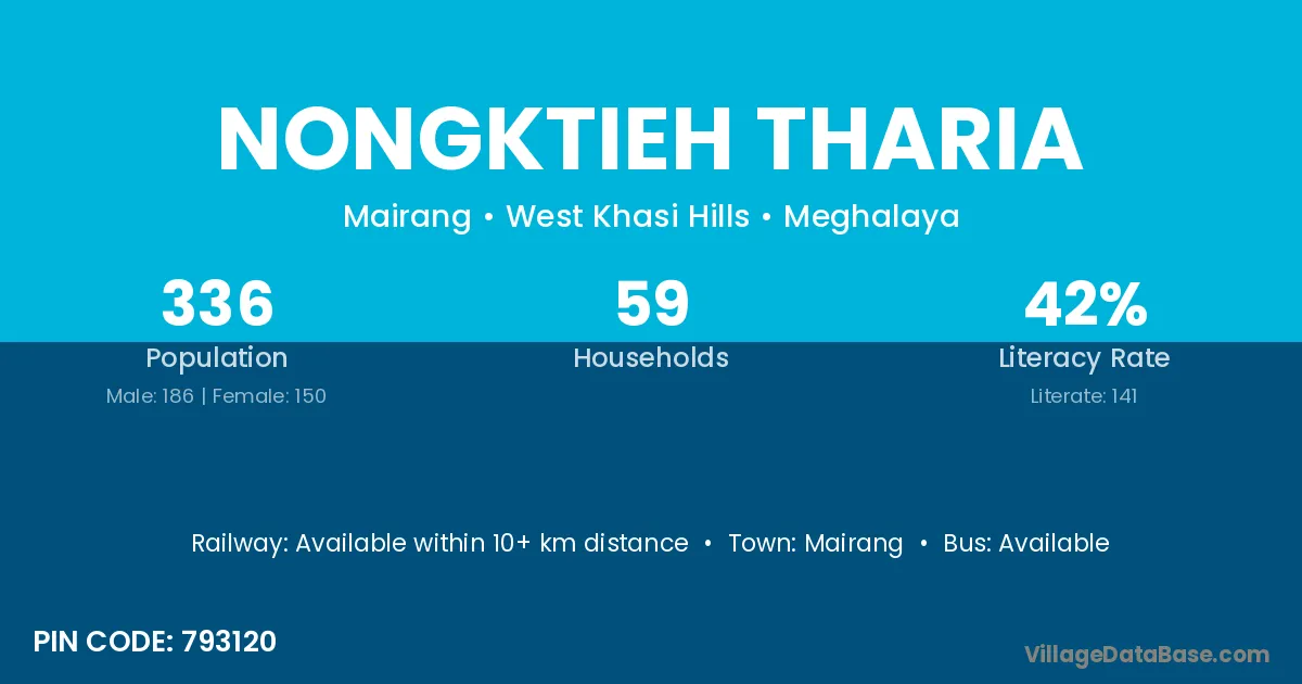 Nongktieh Tharia village has a total population of 336 people, of which 186 are males and 150 are females.