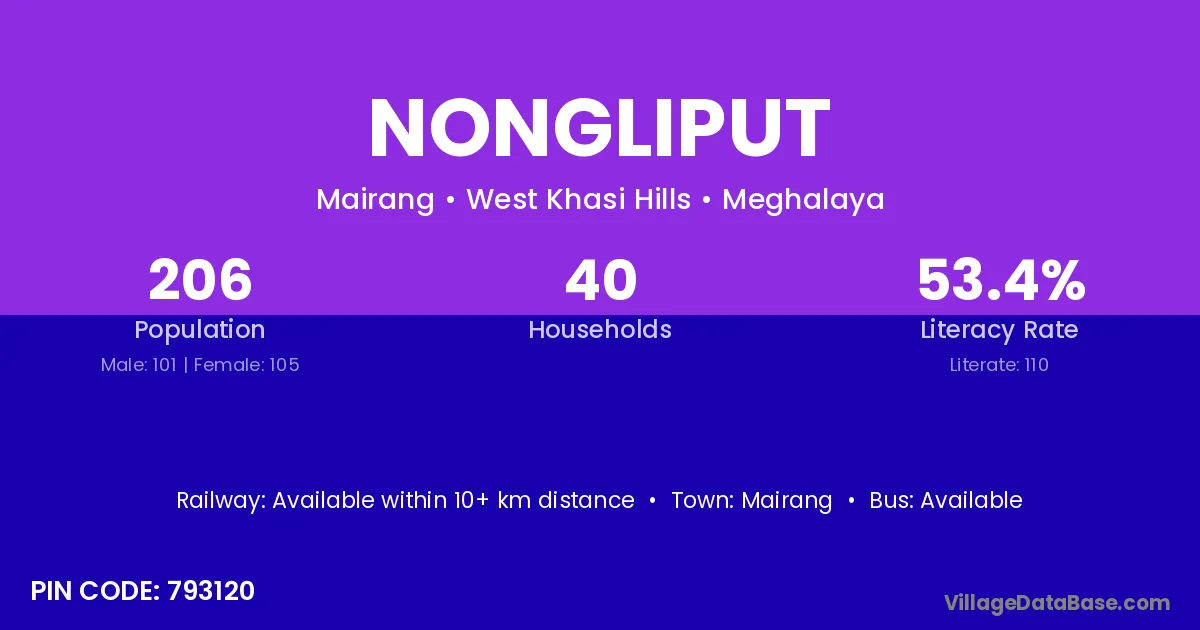 The literacy rate of Nongliput village is 53.40%. Male literacy stands at 42.57% and female literacy at 63.81%.
