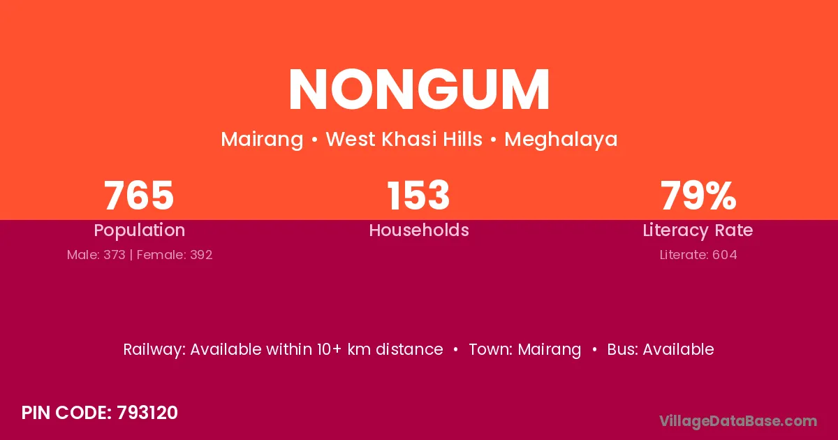 Nongum village has a total population of 765 people, of which 373 are males and 392 are females.
