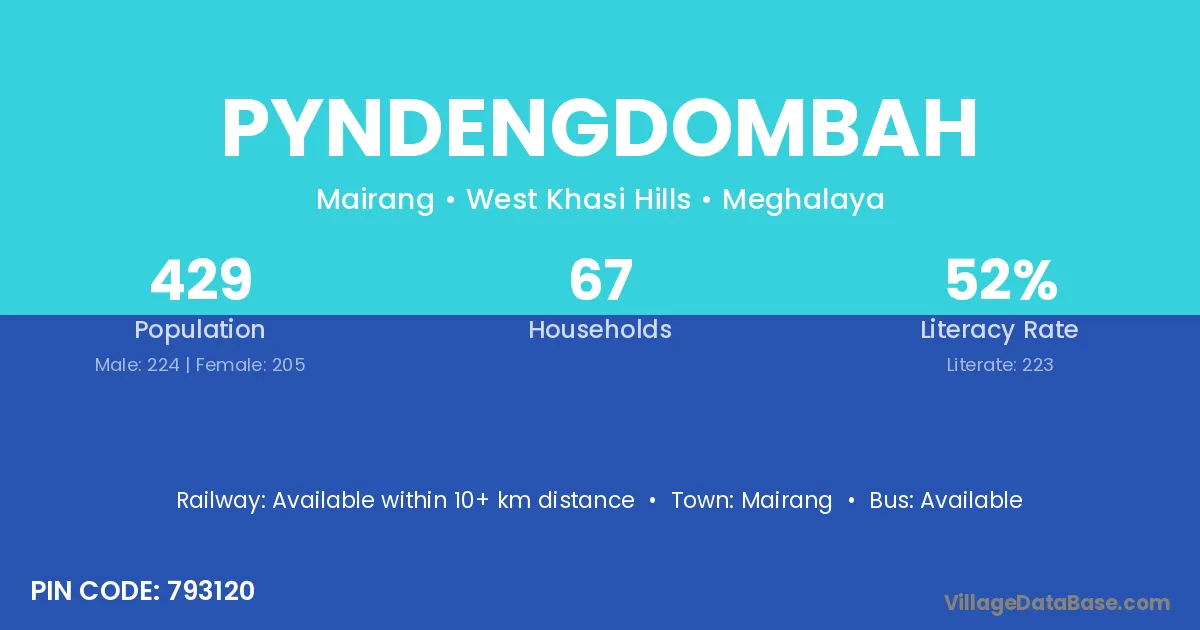 Pyndengdombah village has a total population of 429 people, of which 224 are males and 205 are females.