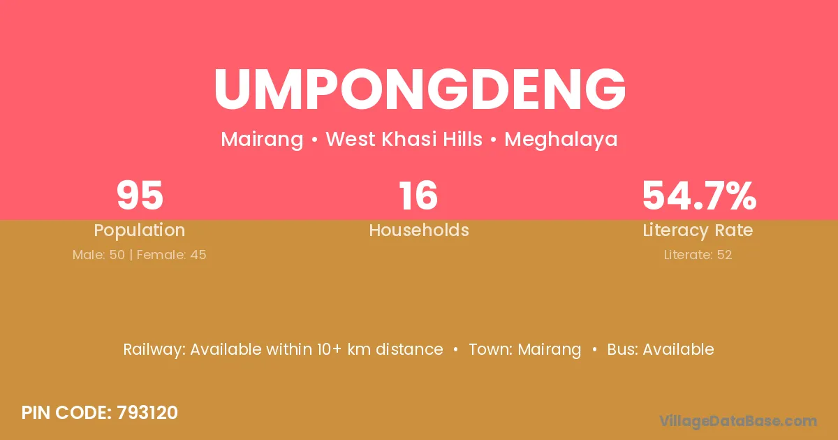 Umpongdeng village has a total population of 95 people, of which 50 are males and 45 are females.