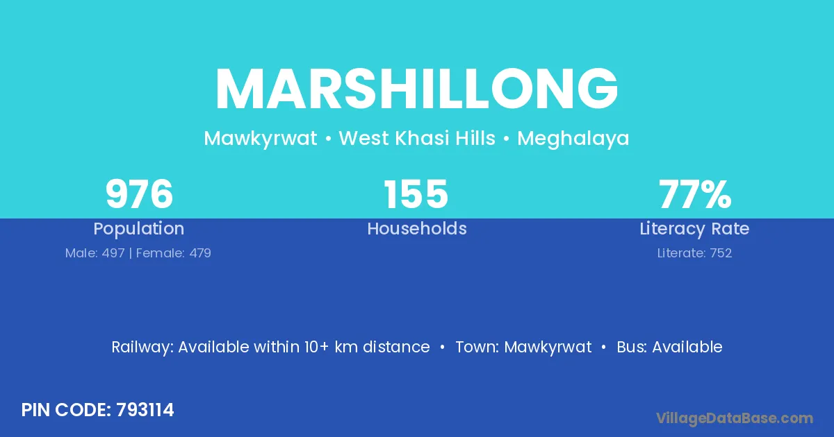 Marshillong village has a total population of 976 people, of which 497 are males and 479 are females.