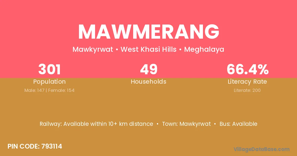 Mawmerang village has a total population of 301 people, of which 147 are males and 154 are females.