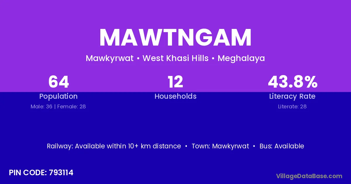 Mawtngam village has a total population of 64 people, of which 36 are males and 28 are females.