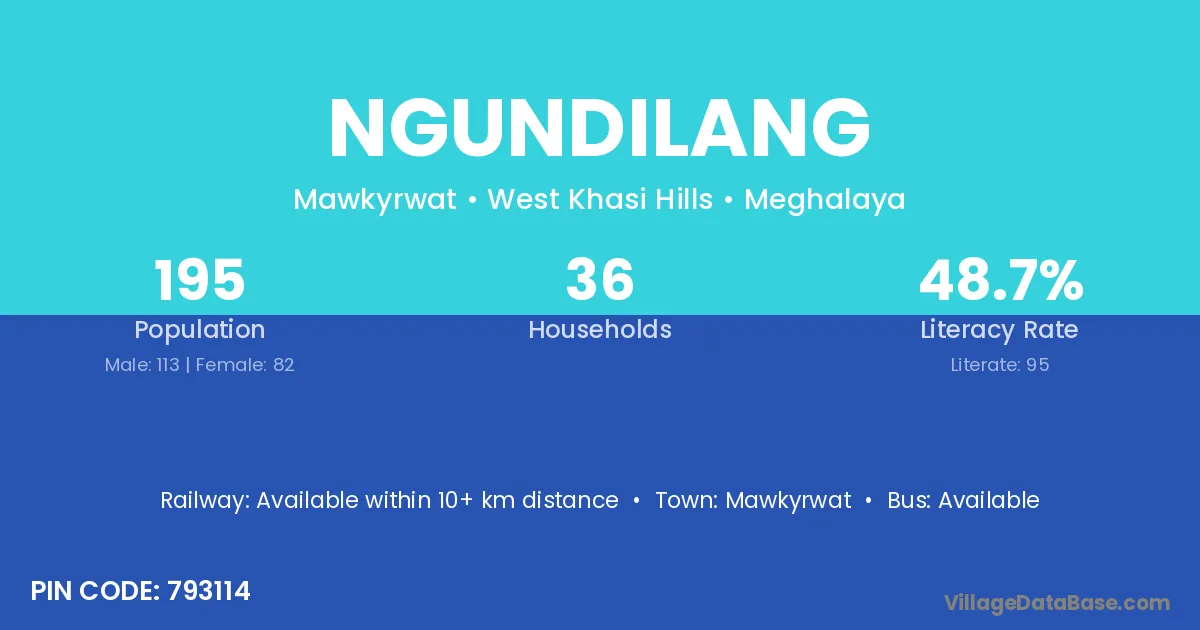 Ngundilang village has a total population of 195 people, of which 113 are males and 82 are females.