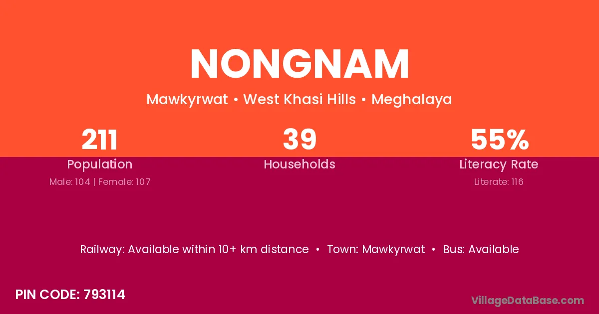 Nongnam village has a total population of 211 people, of which 104 are males and 107 are females.