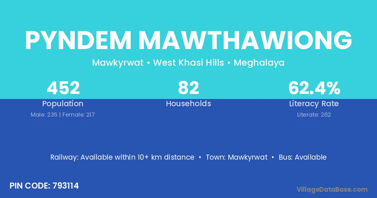 Pyndem Mawthawiong village has a total population of 452 people, of which 235 are males and 217 are females.